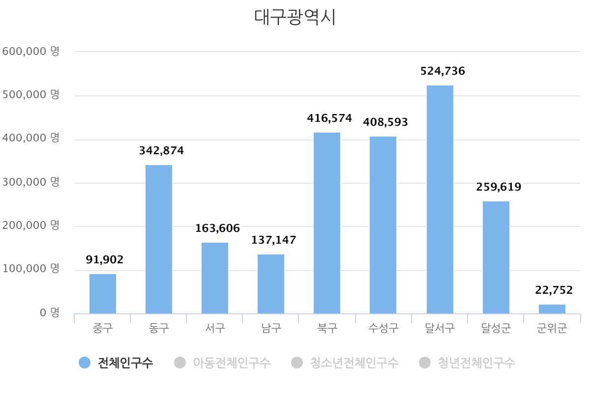 행정안전부에서 제공하는 DB 주민등록 인구통계 2024년 5월 말 기준의 데이터를 근거로 대구시 주요 구의 총인구수, 아동 인구수, 청소년 인구수, 청년 인구수 현황을 알아보았습니다.