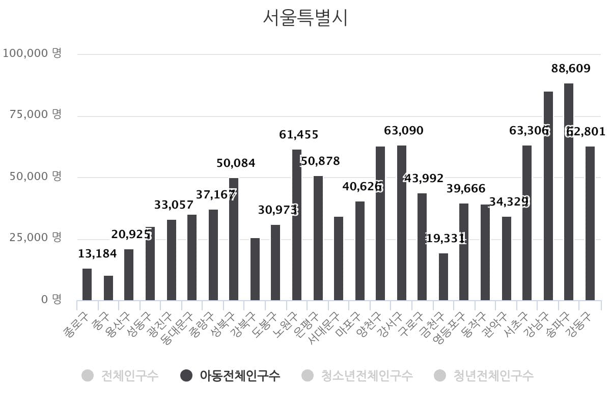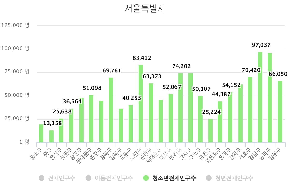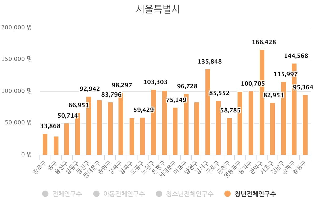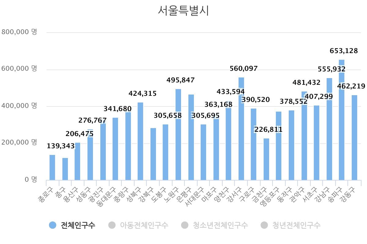 행정안전부에서 제공하는 DB 주민등록 인구통계 2024년 5월 말 기준의 데이터를 근거로 서울시 주요 구의 총인구수, 아동 인구수, 청소년 인구수, 청년 인구수 현황을 알아보았습니다.